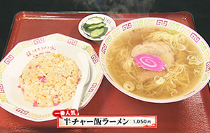 一番人気は 「半チャー飯ラーメン」。なるとがのった昔ながらのラーメンのスープは豚骨 鶏 サバ トビウオを使った深みのある味わい。国産豚を3時間じっくり煮込んだとろとろチャーシューは絶品です。チャーハンはしょうゆの香りが香ばしいしっとりタイプです。