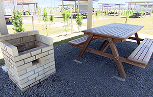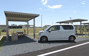 オートサイトはゆったり広々。日差しを避けながらバーベキューが楽しめる屋根もあり、炭火の焼台や6人掛けのテーブルを設置。