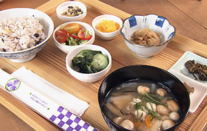 石巻の郷土料理“おくずかけ”は初めて食べてもどこか懐かしいような優しいおいしさ。石巻の桃生地区でとれた“桃生茶”が南部鉄器で提供されます。