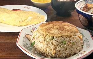 ご飯ものも町中華ならでは。ラーメンの中華スープを使いほんのり甘めの味付けがうまいカツ丼、卵の帽子が特徴的なチャーハン、オムライスも変わらぬ人気メニューです。