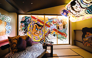 日本を代表する祭りのひとつ「青森ねぶた祭」の 熱気を感じる館内。ウェルカムドリンクはなんと蛇口からりんごジュースが出るんです。