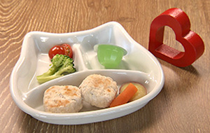 ワンちゃんのハンバーグランチは鶏肉100%のハンバーグと野菜もついてヘルシー。ふわふわ食感のワンちゃんシフォンケーキもあります。