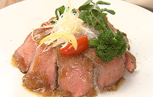 イチオシの食事メニューはしっとりやわらかローストビーフ丼。ジンジャーと玉ねぎの2種ソースがしっとりとしたお肉の味を引き立ててくれます。