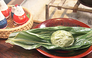 今が旬のよもぎを練り込んだ「笹だんご」はあんこの優しい甘さ、だんごをくるんでいる笹の香りもさわやかです。
