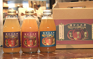お土産で人気の「復古(レトロ)三兄弟リンゴジュース」は店内で飲みくらべSETで楽しむことができます。緋の衣・赤玉・国光を使用した日本のリンゴのルーツとも言える3品種が味わえます。