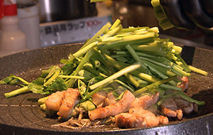 宮城が誇る仙台セリを使ったミナリサムギョプサル。分厚くカットされた蔵王の豚肉JAPANX焼き、その上からセリを押し付けるようにさらに焼いていきます。