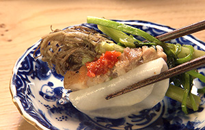大根の千枚漬けに挟み、お店の自家製ポン酢でいただきます。セリのさわやかなほろ苦さと豚肉の脂の甘みがベストマッチ。白米との相性も抜群です。